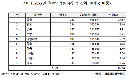 우라나라의 원료 의약품 수입국이 중국과 인도에 편중돼 있어 공급망 취약한 구조가 고착화되고 있다는 우려가 제기됐다.