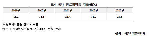 이는 팬데믹이나 국제 분쟁 상황에서 해외 공급이 끊기면 국민의 생명과 직결되는 필수 의약품조차 구할 수 없는 상황이 올 수 있다고 우려했다.