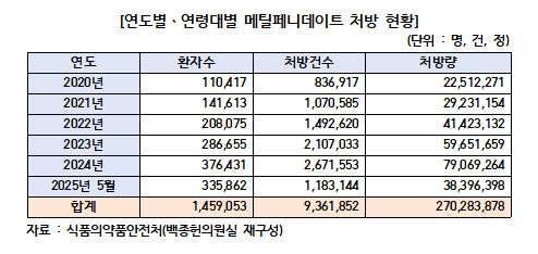 의원실에 따르면 연도별로 2020년 2251만정에서 매년 급증해 2024년에는 7906만정으로 5년간 3.5배 폭증했다. 환자수도 2020년 11만417명에서 2024년 37만6431명으로 3.4배 증가했으며 2025년 5월 기준 이미 3839만정이 처방됐다.