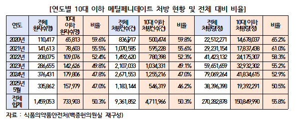 실제 10대 이하가 전체 처방량의 절반 이상을 차지하고 있는 것으로 분석됐다. 2020년부터 2025년 5월까지 10대 이하 처방량은 총 1억 5085만정으로 전체의 55.8%에 달했다.