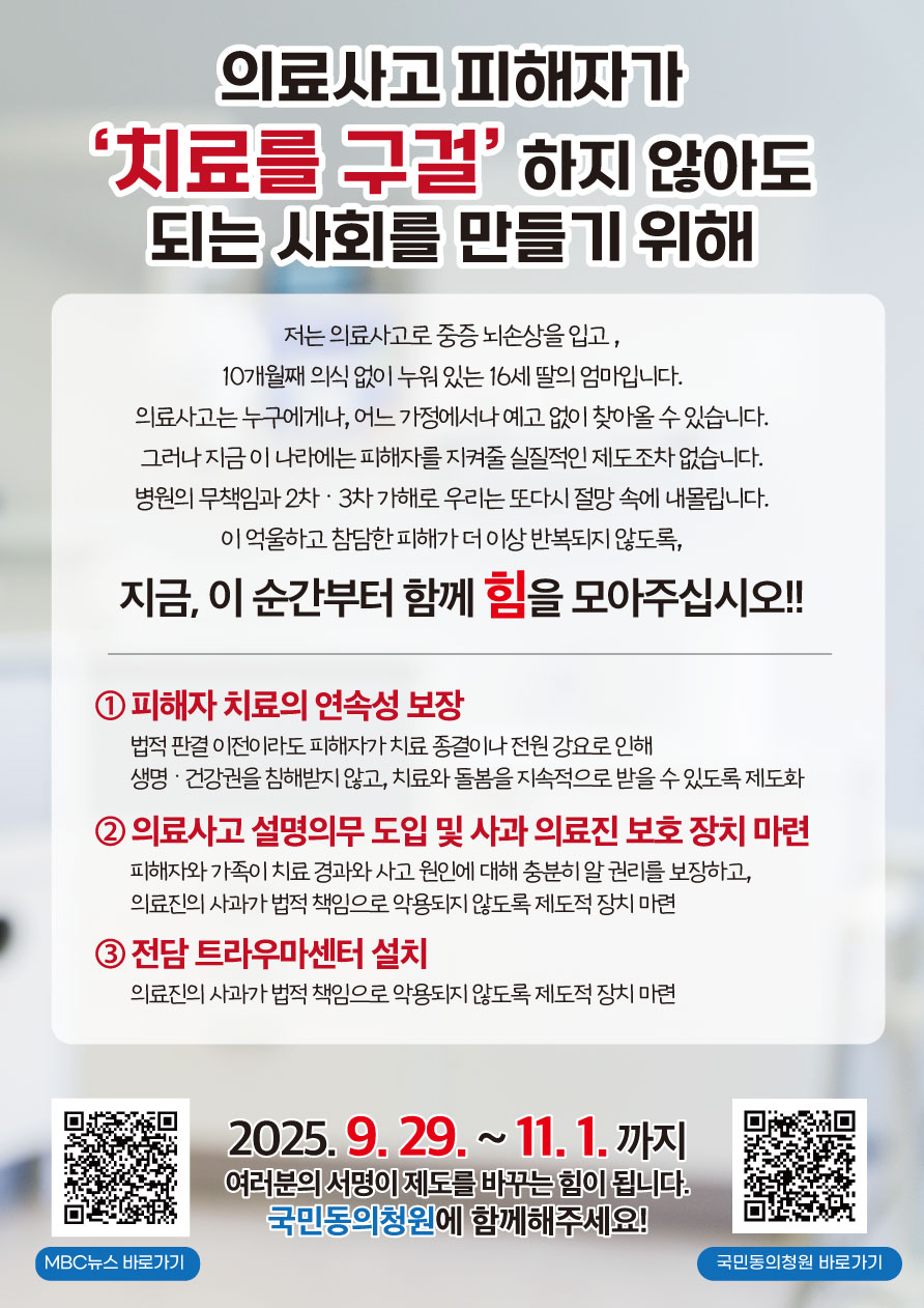 청원은 ▲법적 판결 이전이라도 피해자가 치료 종결이나 전원 강요 없이 지속적인 치료를 받을 수 있도록 제도화, ▲의료사고 설명의무 및 사과 의료진 보호장치 마련, ▲의료사고 피해자 전담 트라우마센터 설치 등 3가지 요구사항을 담고 있다.