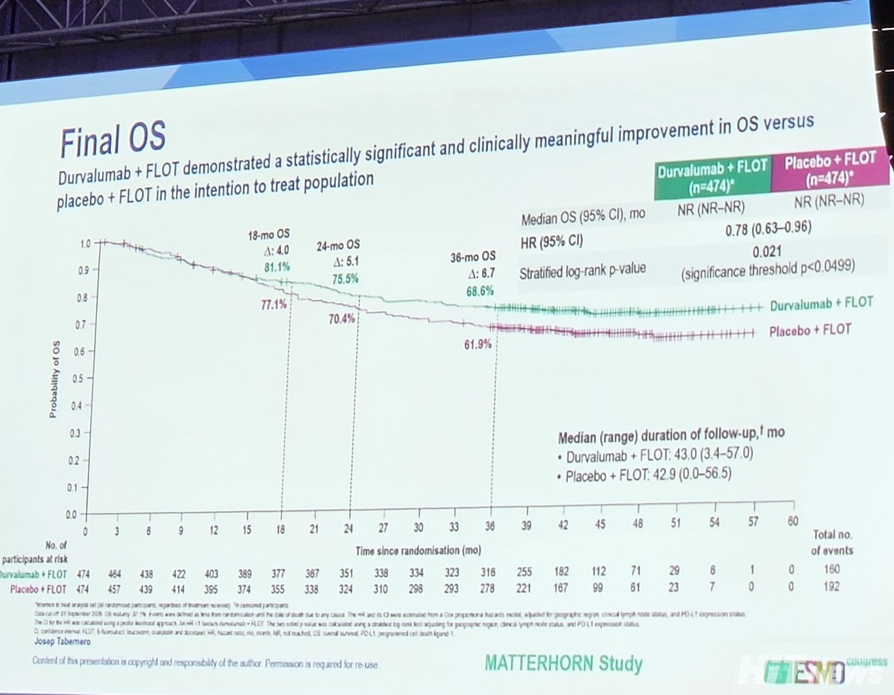 지난 17일 독일 베를린에서 개최된 유럽종양학회(ESMO 현지시각)에서는 절제 가능한 위암 환자에서 임핀지+FLOT(5-플루오로우라실+류코보린+옥살리플라틴+도세탁셀) 요법과 위약+FLOT 요법을 비교한 3상 'MATTERHORN' 연구의 전체생존기간(OS) 분석 데이터가 공개됐다.