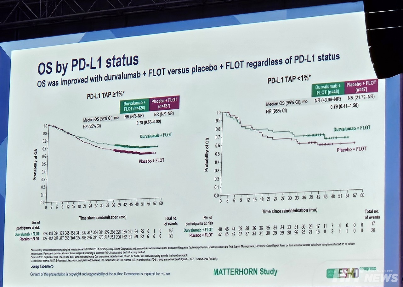 이번 연구에서 환자들은 수술전후 각 2주간 보조요법으로 FLOT이 투여됐고, 이후 임핀지 또는 위약 단독 유지요법이 10주기 동안 시행됐다. 연구진은 이 연구의 1차 유효성평가변수를 무사건 생존기간(EFS)로, 2차 유효성평가변수로 OS, 병리학적 완전관해율(pCR), 주요 병리학적 반응률(MPR), 림프절 전이 상태(ypN)로 설정했다.