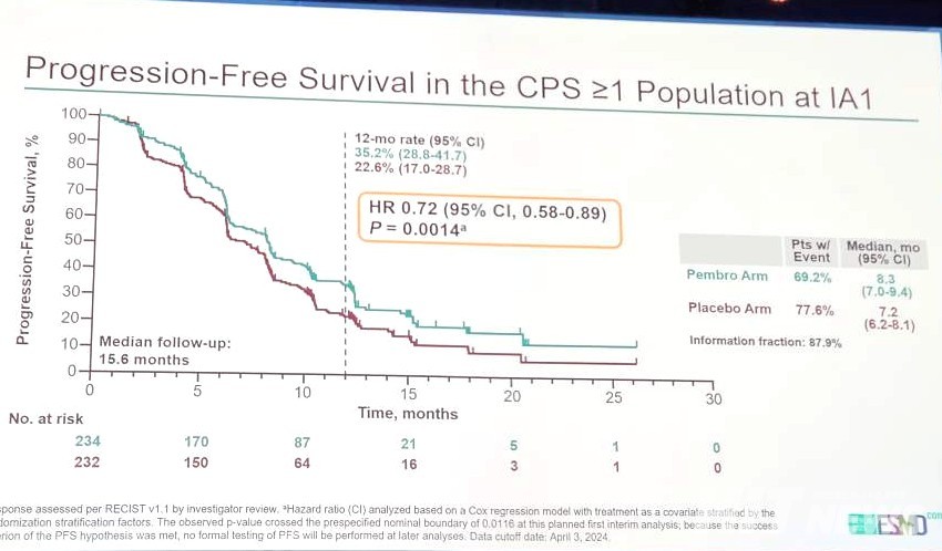 1차 중간분석 결과 발표 당시(중앙 추적관찰기간 15.6개월), 키트루다군은 PD-L1 CPS 1이상 환자군과 전체 환자군 모두에서 무진행생존기간의 개선을 입증했었다.