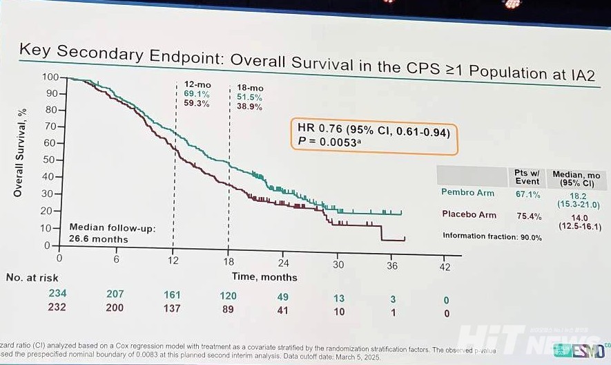 더불어 약 1년 후인 2차 중간 분석 결과가 이번에 발표됐다(중앙 추적관찰기간 26.6개월). PD-L1 CPS 1이상 환자군에서 OS의 유의미한 개선이 입증됐는데, 키트루다군에서 18.2개월, 위약군에서 14.0개월로, 약 24%의 사망 위험을 낮춘 것으로 분석됐다(HR=0.76, 95% CI : 0.61-0.94, p=0.0053).