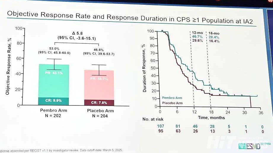 18개월 시점 PD-L1 CPS 1 이상 환자에서 객관적반응률(ORR)은 53.0%(부분관해(PR) 43.1%, 완전관해(CR) 9.9%)로 나타났으며, 대조군에서는 46.6%(38.7%, 7.8%)였다.