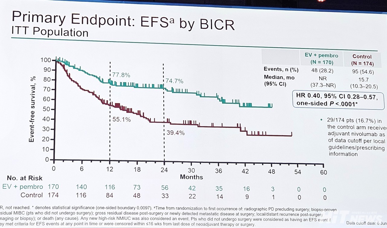 다만 대조군은 15.7개월(95% CI : 10.3-20.5)의 EFS 중앙값에 도달한 반면, 키트루다군은 아직 중앙값 관찰 시점에 도달하지 않았다(95% CI : 37.3-NR).