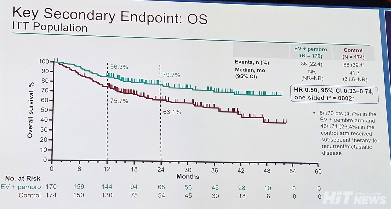 EFS와 마찬가지로 병용군의 OS 또한 아직 중앙값에 도달하지 못했다(95% CI : NR-NR). 다만, 지속적으로 대조군(41.7개월, 95% CI : 31.8-NR)과 차이가 벌어지는 경향을 보였다.