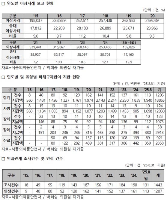 국회 보건복지위원회 소속 더불어민주당 박희승 의원은 식품의약품안전처 제출 자료를 분석한 결과, 2015년부터 올해 6월까지 접수된 의약품 이상사례 보고는 296만 8865건으로 집계됐다고 20일 밝혔다. 이 가운데 '중대 이상사례'는 29만 2136건으로 전체 이상사례의 9.8%를 차지했으며, 올해 이상사례 보고 중 중대 이상사례가 차지하는 비율은 12.9%로 최근 11년 중 최대치를 기록했다.