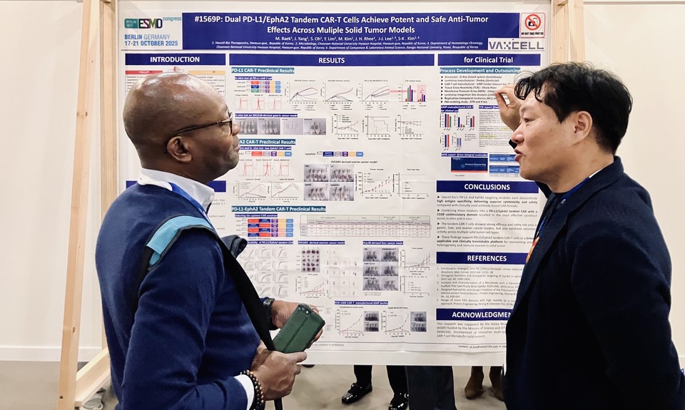 박셀바이오(대표 이제중)는 지난 17일부터 21일까지 독일 베를린에서 열리는 유럽종양학회(ESMO 2025)에서 PD-L1/EphA2 이중표적 CAR-T 세포치료제의 비임상 연구결과를 포스터로 발표했다고 20일 밝혔다.