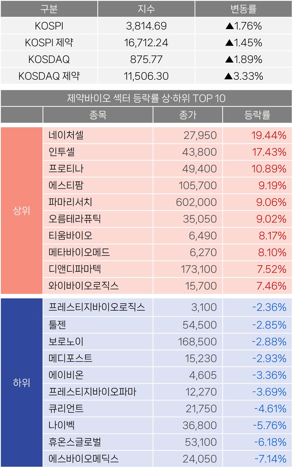 한편 이날 코스피는 사상 최고치인 3800선을 돌파했으며 코스피·코스닥 제약 지수는 모두 상승 마감했다. 제약바이오 섹터에서는 인투셀(17.43%), 프로티나(10.89%), 에스티팜(9.19%) 등이 오르며 상승세를 이끌었다. 반면 에스바이오메딕스(-7.14%), 휴온스글로벌(-6.18%), 나이벡(-5.76%) 등은 하락세를 보였다.