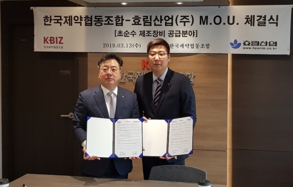 한국제약협동조합(이사장 조용준, 동구바이오제약 대표)은 13일 초순수 제조장비 전문 업체인 효림산업(대표이사 남태훈)와 업무협약을 체결했다.