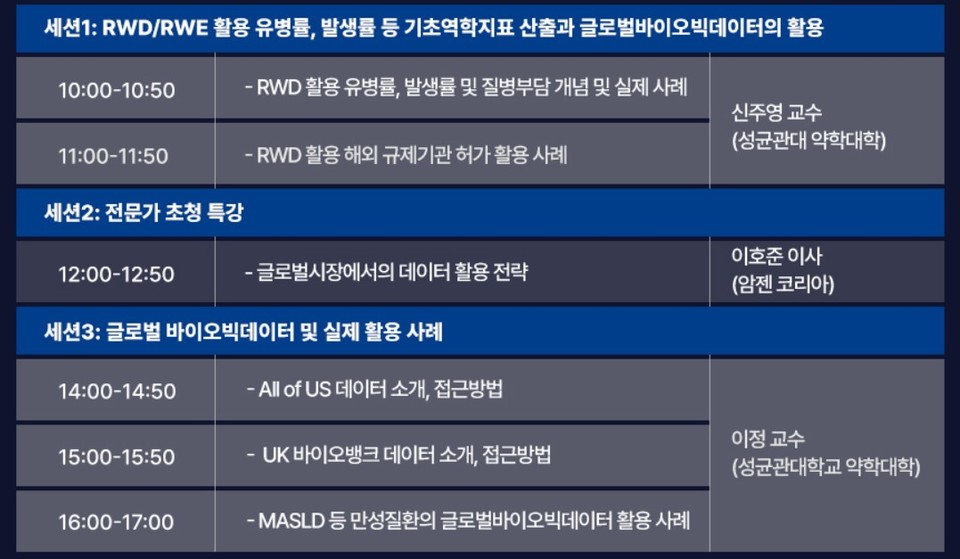 전문가 초청 특강으로 진행되는 두 번째 세션에는 암젠코리아 이호준 이사가 연자로 나서 '글로벌 시장에서의 데이터 활용 전략'을 주제로 발표한다.