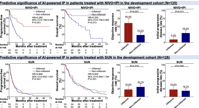 AI 기반 면역표현형(IP) 바이오마커를 진행성 투명세포형 신세포암(ccRCC) 환자 대상 니볼루맙(옵디보) 및 이필리무맙(여보이) 병용치료와 수니티닙(수텐) 단독치료 효과 예측에 적용한 연구에서, AI로 분류한 면역활성 환자의 객관적 반응률(ORR)은 60.5%로, 비활성 환자(23.2%) 대비 현저히 높게 나타났습니다.