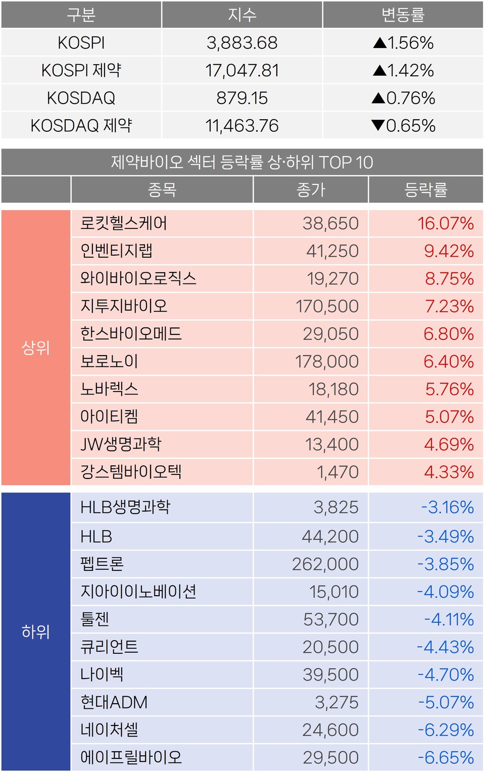 한편 제약바이오 개별 종목으로 인벤티지랩(9.42%), 와이바이오로직스(8.75%), 지투지바이오(7.23%) 등은 강세를 보인 반면, 에이프릴바이오(-6.65%), 네이처셀(-6.29%), 현대ADM(-5.07%) 등은 하락했다.