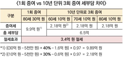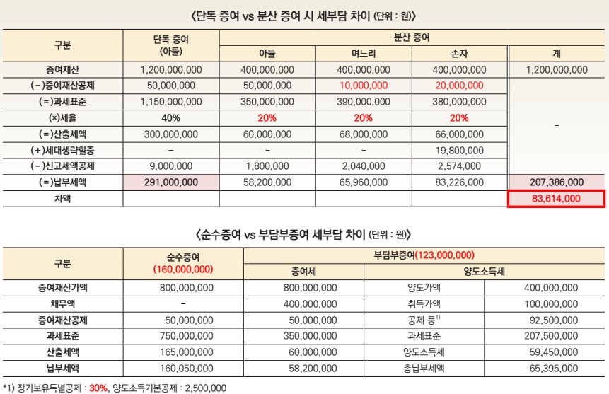 각각 4억 원씩 줄 경우, 세부담 차이는 얼마나 될까요?"