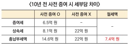 사전 증여 없이 상속이 개시된다면 30억 원이 넘는 재산에 대하여 50%의 상속세를 내야 하지만, 상속 개시 10년 이전에 자녀들에게 10억 원씩 증여했다면 30%의 증여세에 해당하는 2.2억 원 정도만 각 자녀가 부담하면 된다. 이에 따라 상속 재산이 감소하므로 실제 상속이 개시된다 하더라도 사전 증여를 하지 않았을 때와 비교하면 약 7.4억 원의 세금이 절감되는 것을 알 수 있다.