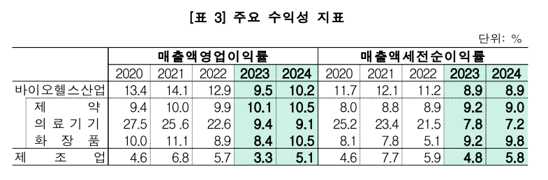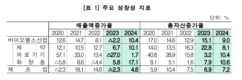 보고서에 따르면 2024년 바이오헬스산업 제조업체의 매출액증가율은 전년(–2.2%) 대비 크게 상승한 10.4%를 기록했다. 업종별로는 제약이 6.7%에서 10.1%로, 화장품이 5.8%에서 17.1%로 두 배 이상 성장했다. 의료기기는 전년 –27.0%에서 1.7%로 회복하며 상승 전환했다.