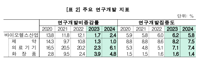 의료기기(6.1%)와 화장품(4.8%)의 연구개발비 증가율은 각각 전년 대비 3.8%p, 0.9%p 확대된 반면, 제약은 1.0%로 전년과 유사한 수준을 유지했다.