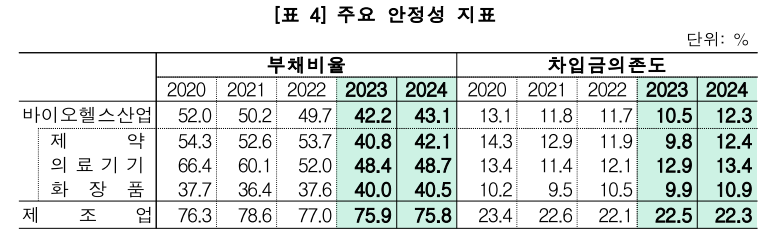 수익성 지표에서는 매출액영업이익률이 9.5%에서 10.2%로 상승했고, 매출액세전순이익률은 8.9%로 전년과 같은 수준을 유지했다. 업종별로는 제약(10.5%)과 화장품(10.5%)이 모두 전년보다 개선된 반면, 의료기기는 9.1%로 소폭 하락했다. 세전순이익률은 화장품이 9.8%로 상승했고, 제약(9.0%)과 의료기기(7.2%)는 다소 낮아졌다.