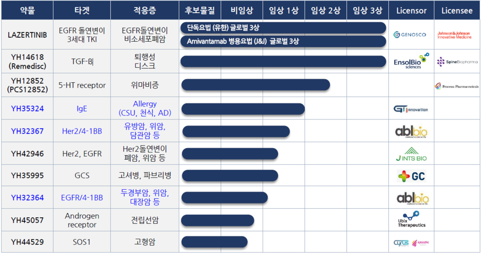 그러나 렉라자를 제외하고 임상 3상 등 상업화 단계를 목전에 둔 후보 물질은 현재 없는 상황이다. YH14618은 미국 스파인바이오파마에 기술수출해 2024년 미국 임상 3상 시험을 진행했지만 최근 임상 실패 소식이 전해졌다.