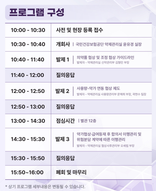 건보공단에 따르면 이날 설명회에서는 △의약품 협상 및 조정 협상 가이드 라인과, △사용량 -약가 연동 협상제도, △약가협상 · 급여등재 후 합의서 이행관리 및 위험분담 계약에 따른 이행관리로 진행된다. 오전 10시부터 오후 4시까지며, 200명으로 제한해 사전신청이 필요하다.