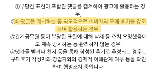 가이드라인과 질의내용에서는 소비자가 단순히 후기를 올리는 것은 가능하지만 영업자가 의도적으로 후기를 알리는 것은 광고에 해당한다고 나와있다. 대댓글을 게시하는 등 의도적으로 소비자의 구매 후기를 강조하는 경우는 행정조치 대상이다.
