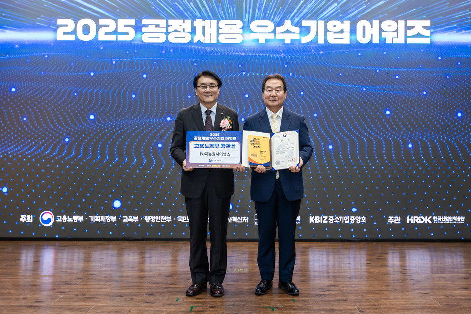 합성의약품 CDMO(위탁개발생산) 기업 제뉴원사이언스(대표 전광현)가 '2025 공정채용 우수기업 어워즈'에서 고용노동부 장관상을 수상했다고 10일 밝혔다.