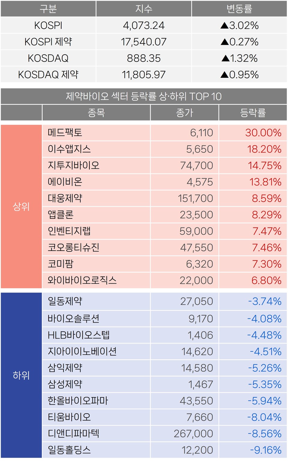 제약·바이오 업종에서는 이수앱지스(18.20%), 지투지바이오(14.75%), 에이비온(13.81%) 등이 강세를 보였고, 반면 일동홀딩스(9.16%), 디앤디파마텍(8.56%), 티움바이오(8.04%)는 약세로 마감했다.