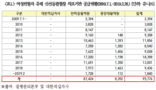 한마음혈액원은 2009년7월1일부터 올해 2월 26일까지 9년 8개월 동안 총 8만 7,424개 유니트의 여성헌혈자 신선동결혈장을 수혈용으로 공급해왔던 것으로 나타났다. 또 중앙대혈액원도 지난 2012년부터 올해 2월 26일까지 7년 2개월 동안 총 8,352개 유니트의 여성헌혈자 신선동결혈장을 수혈용으로 공급해 총 95,776개 유니트의 여성헌혈자 신선동결현장이 수혈용으로 환자들에게 제공됐다.