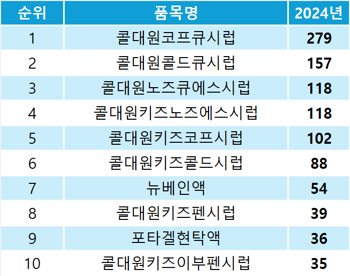 콜대원키즈콜드시럽(88), 뉴베인액(54), 콜대원키즈펜시럽(39), 포타겔현탁액(36), 콜대원이부펜시럽(35)도 톱10에 들었다.