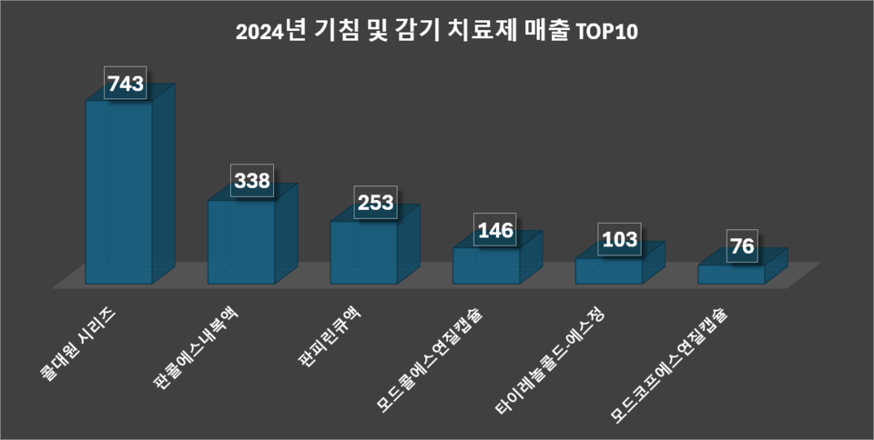 특히 콜대원 시리즈(콜대원코프큐시럽, 콜대원콜드큐시럽, 콜대원노즈큐에스시럽, 콜대원키즈코프시럽, 콜대원키즈콜드시럽) 5개 품목의 2024년 OTC 인덱스는 743을 기록했다.