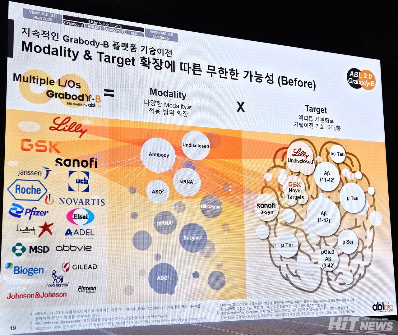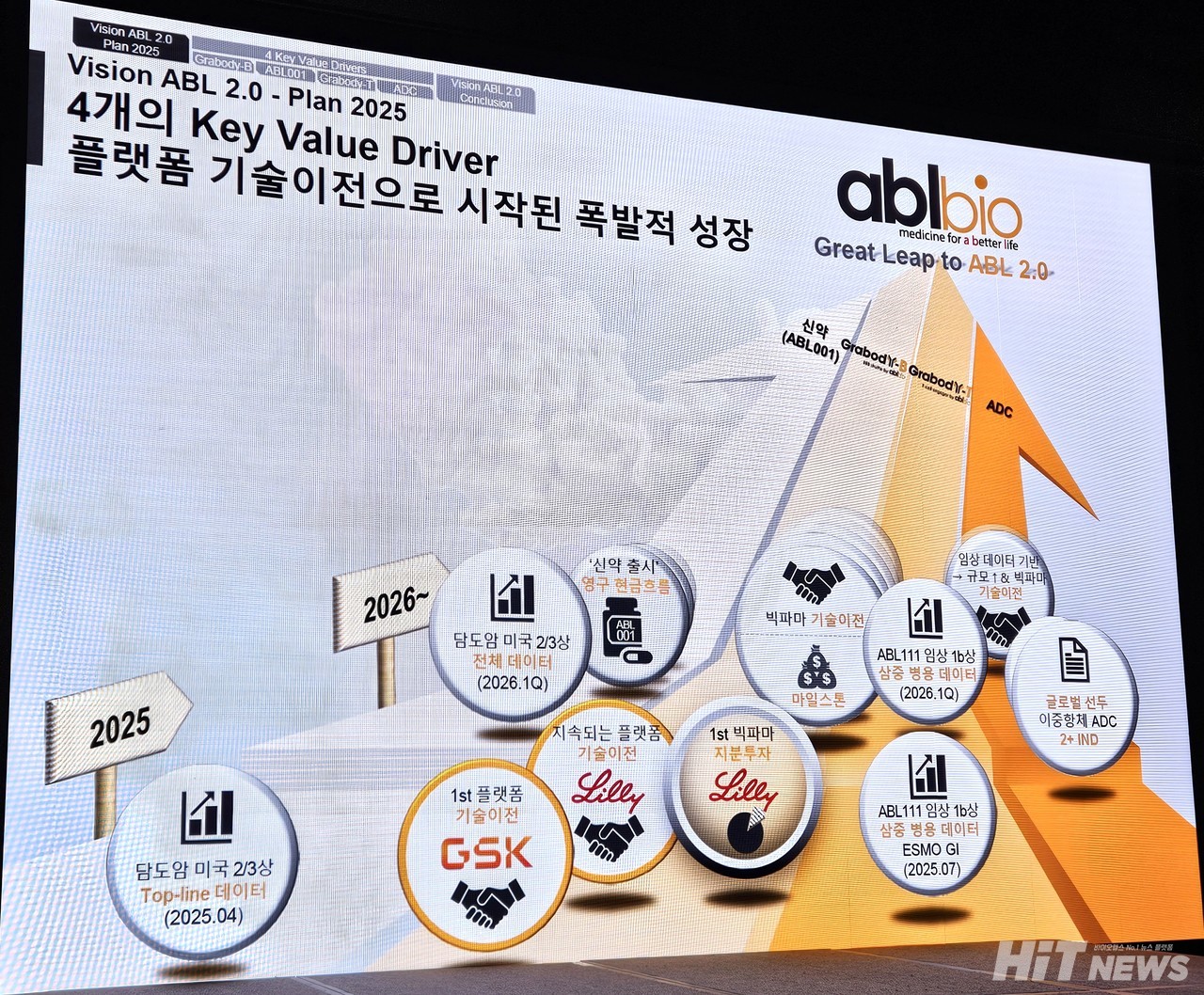 는 "몇 달 전 GSK 딜 성사 후 개최된 기업설명회에서 2025년부터 'Exponential growth(점진적 성장)'을 말한 바 있다. 이것이 가능했던 이유는 에이비엘바이오가 빅파마 지분투자, 플랫폼 기술 구축, 파이프라인 확장, 대규모 기술이전 등을 지속적으로 달성해왔기에 가능했던 것"이라며 "ADC, 차세대 BBB 셔틀 등에 있어서도 선두가 될 수 있도록 지속적으로 노력하겠다"고 강조했다.