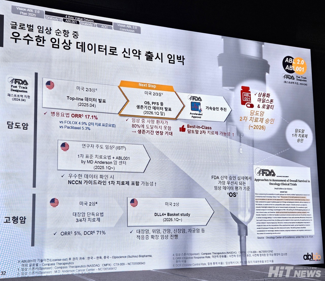 ABL001은 VEGF와 DLL4 타깃 이중 항체로, 콤패스 테라퓨틱스가 담도암 항암제로 글로벌 임상을 진행하고 있다. 2024년 4월 미국 FDA에 패스트트랙(Fast Track)으로 지정된 만큼, 이번 2/3상 데이터 공개 후 가속승인이 추진될 것으로 전망된다.