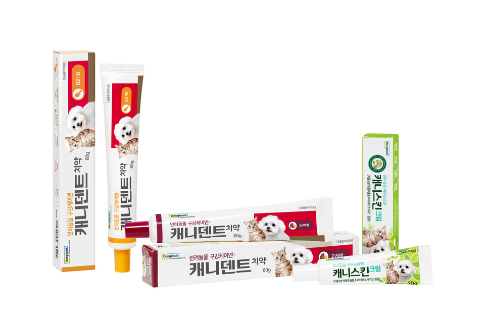 동국제약이 반려동물 전용 구강관리 제품 '캐니덴트'와 보습크림 '캐니스킨' 판매를 확대하고 있다고 18일 밝혔다. 반려동물 양육 가구 증가로 관련 헬스케어 시장이 커지면서 제품군을 강화하고 있다는 설명이다.