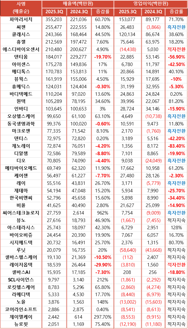 메디컬 에스테틱 기업 파마리서치가 의료기기 분야(미용 의료기기·헬스케어 솔루션·의료 AI) 3분기 누적 매출액 1위를 차지했다. 이외 다른 기업도 지난해 모든 분기 매출을 초과하는 등 상승세를 보였다.