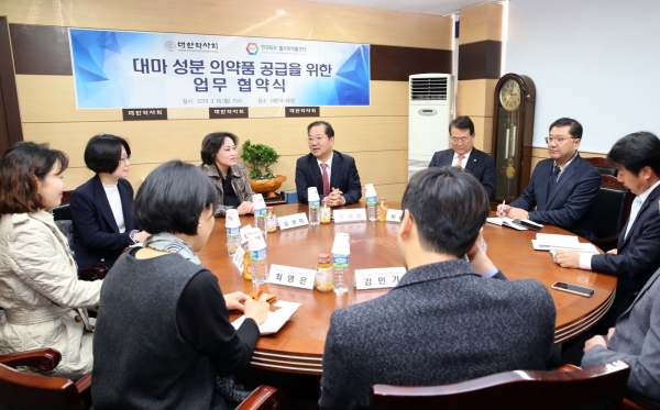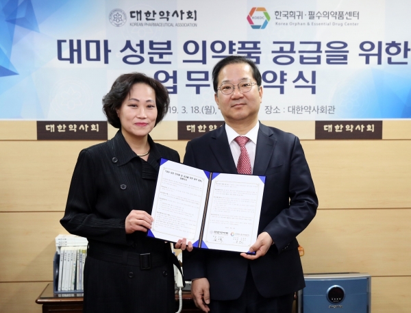 대한약사회(회장 김대업)와 한국희귀필수의약품센터(원장 윤영미, 이하 센터)는 지난 18일 서초동 대한약사회관에서 의료용 대마의 안정 공급을 위한 업무 협약을 체결했다.
