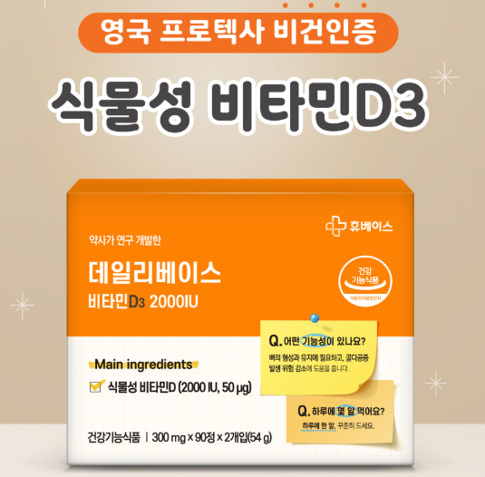 휴베이스에 따르면 이번 제품의 가장 큰 변화는 자연 유래 식물성 원료를 적용한 점이다. 영국 Protec사의 해조류 기반 비건 인증 비타민D3를 사용해 원료 안전성과 순도를 강화했으며, 자연성분 및 비건 라이프스타일을 선호하는 소비자 취향을 반영했다.