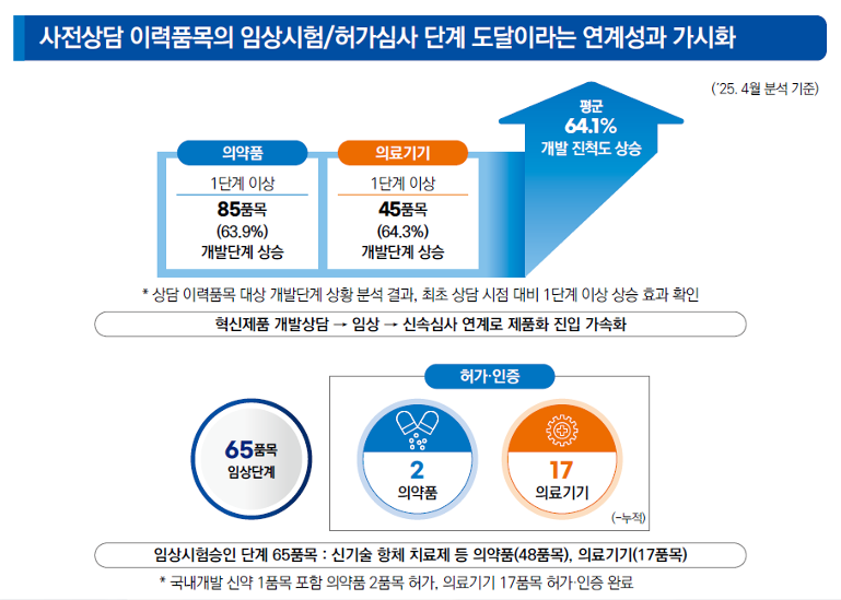 식약처가 이 중 응답을 완료한 203개 품목(의약품 133개, 의료기기 70개)에 대한 개발 진행 상황을 분석한 결과 최초 상담 당시 비임상 단계에 있던 제품 중 임상 단계 등으로 개발이 진전된 사례는 의약품 85건, 의료기기 45건으로, 전체의 약 64%에서 개발 단계 진척이 이뤄졌다.
