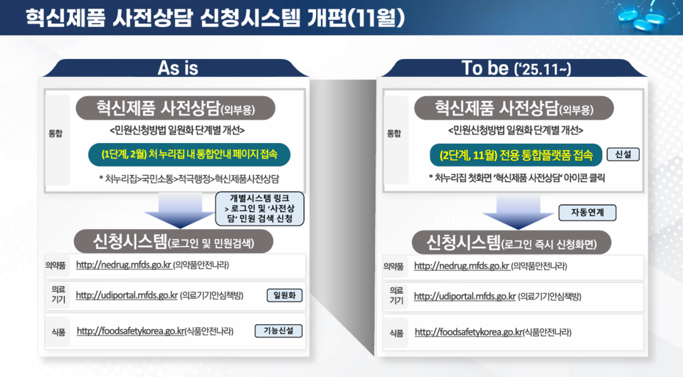 그러나 11월부터는 식약처 메인 홈페이지에 '혁신제품 사전상담' 코너를 클릭하면 '사전상담 통합창구'로 바로 연결된다.