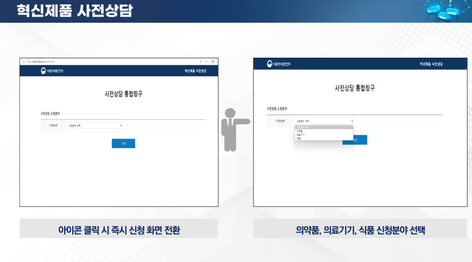 과거에는 '식품의약품안전처 누리집 → 국민소통 → 적극행정 → 혁신제품 사전상담' 순서로 접근해 '의약품ㆍ바이오의약품ㆍ의료기기 분야 선택 후 사전상담' 신청을 하는 방식이었다.