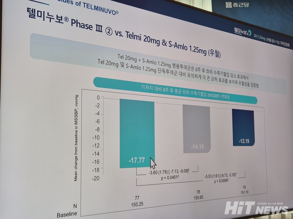 종근당이 공개한 임상 3상 결과는 저용량 복합요법의 장점을 제시했다. 텔미누보 20/1.25mg은 8주 투여 시 단독 표준요법 대비 더 큰 혈압강하를 보였으며, 목표 혈압 도달률 역시 꾸준히 앞선 것으로 나타났다. 특히 텔미사르탄과 S-암로디핀 각각의 단일요법과 비교한 임상에서는 두 약을 결합했을 때 혈압강하가 가장 큰 폭을 보였다.