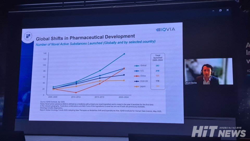 발표에 따르면 지난 10~20년간 절대적 리더였던 미국 중심의 개발 구도는 이미 균열을 보이고 있다. 데이비스 총괄은 "신물질 승인 건수를 기준으로 글로벌 리더를 꼽자면 이제 미국과 중국 사이에서 쉽게 결정하기 어려울 정도"라며 "중국 제약 시장이 보여준 성장 속도는 예측을 뛰어넘는 수준"이라고 말했다.