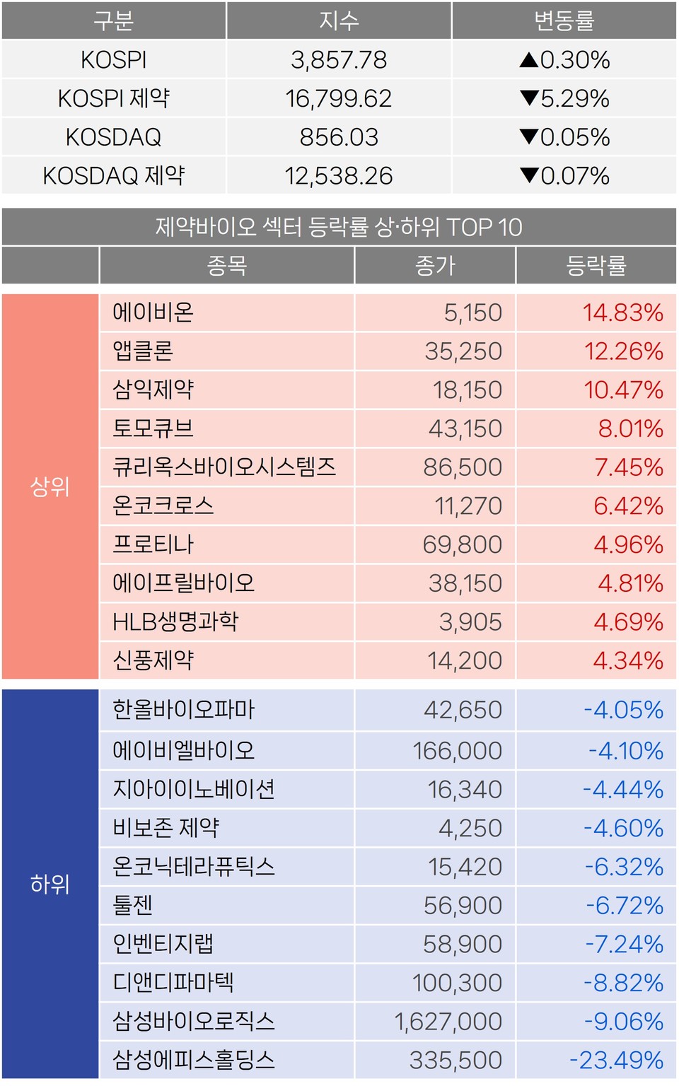 이날 제약바이오 업종 중 에이비온(+14.83%), 앱클론(+12.26%), 삼익제약(+10.47%)이 상승 종목 상위에 올랐고, 한올바이오파마(-4.05%), 디앤디파마텍(-8.82%) 등이 하락 마감했다.