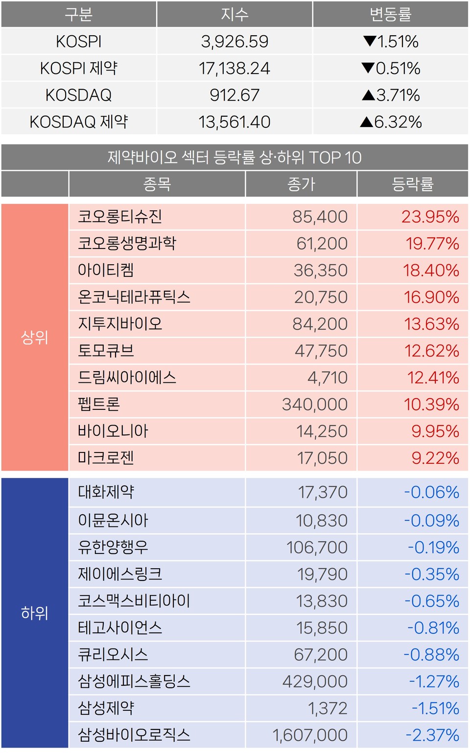 한편 제약바이오 업종 중 코오롱생명과학(19.77%), 아이티켐(18.40%), 온코닉테라퓨틱스(16.90%) 등이 함께 강세를 보인 반면 삼성바이오로직스(-2.37%), 삼성제약(-1.51%), 삼성에피스홀딩스(-1.27%) 등이 약세를 보였다.