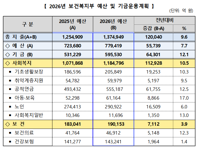 복지부는 "2026년 회계연도 개시 직후 예산이 차질 없이 집행될 수 있도록 배정과 세부계획을 신속하게 준비할 것"이라고 밝혔다.