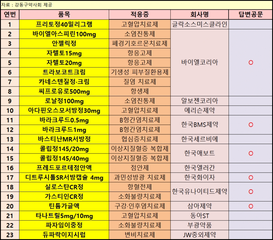 한국유나이티드제약 항혈전제 실로스탄CR정과 소화불량치료제 가스티인CR정, 삼아제약 구강·인후염 치료제 탄툼가글액, 부광약품 소화제 파자임이중정, JW중외제약 변비약 듀파락이지시럽, 동아ST 고혈압치료제 타나트릴5mg/10mg 등 국내 제약사 품목도 포함됐다.