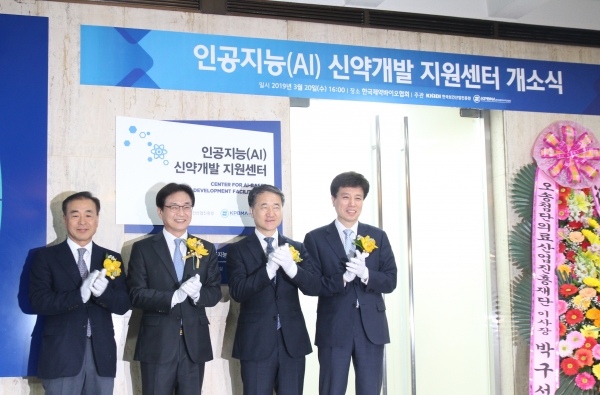 한국제약바이오협회와 보건산업진흥원은 인공지능(AI) 신약개발지원센터를 공동 설립하고 20일 오후 4시 제약바이오협회에서 개소식과 현판식을 진행했다.