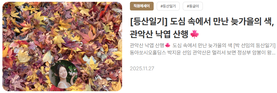 위드동아 홈페이지는 동아쏘시오홀딩스 박지윤 선임의 '관악산 낙엽 산행' 후기, 동아쏘시오홀딩스 안준규 책임 '안 책임의 부동산 재테크 전략, 경매편', 동아제약 이세현 선임 '영웅의 요새, 메이저리그 사관학교–키움 히어로즈' 등 톡톡 튀는 콘텐츠들이 연달아 올라오고 있다.