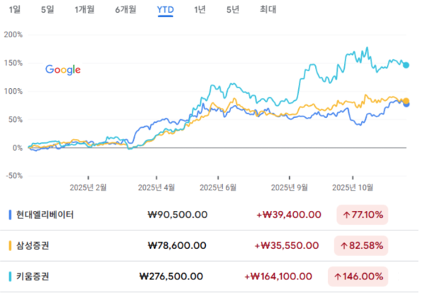17일 종가 기준으로 세 회사의 YTD는 무려 현대엘리베이터가 77%, 삼성증권이 83%, 키움증권이 146%를 각각 기록했다.